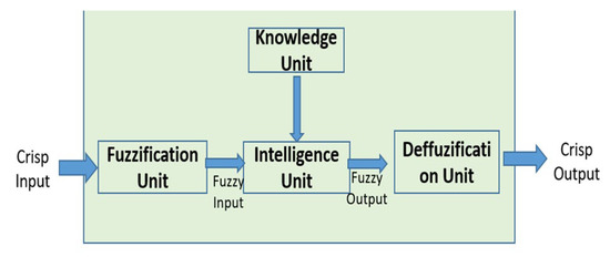 A fuzzy logic control is established on multivalued logic that allows for using common principles and expert knowledge for control rules [40]. Its control method is like human reasoning methods. L.A. Zadeh pioneered the idea of fuzzy logic in 1965 [41], and it has since been developed and adapted for different systems to provide effective and efficient control in many applications. Zadeh defined a fuzzy set as a collection of objects with varying grades of membership identified by a membership function that allocates a scale of membership ranging from zero to one for every object [41]. Fuzzy logic control involves the application of fuzzy sets and theories in control processes. The fuzzy logic control method uses range-to-range or range-to-point strategies—unlike the classical control method, which uses point-to-point control. The fuzzy system (Figure 7) comprises four units: a fuzzification unit, a knowledge unit, an intelligence unit, and a defuzzification unit. Inputs are converted into fuzzy inputs by assigning the associated membership functions to the imprecise inputs at the fuzzification unit. The intelligence and knowledge units work on the fuzzy inputs and infer the proper results by considering the rules to produce a fuzzy output that is converted back to crisp output at the defuzzification unit [30,42]. The fuzzy logic controller is efficiently employed for energy management control thanks to its simple and effective feature adaptability to the nonlinearity of HRES energy supply and demand [34].
