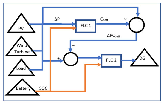The FLC-EMS comprised two FLCs, denoted as FLC1 and FLC2. FLC1 manages the battery charging and discharging, while FLC2 manages the DG operation. The FLC-EMS rules were designed on the basis of expert knowledge and were used to schedule the energy sources in order to meet the load demand while prioritizing renewable energy. The controller could switch at any time of operation, as required, to ensure an energy balance between the energy supply sources and the energy demand of the community. For this study, the membership functions of the variables and the FLC rules were constructed on the basis of the operators’ knowledge; however, in future work, the parameters of the membership functions can be tuned using PSO or any other optimization algorithm, and the fuzzy rules can be chosen on the basis of the optimization algorithm.