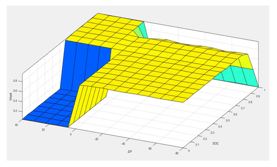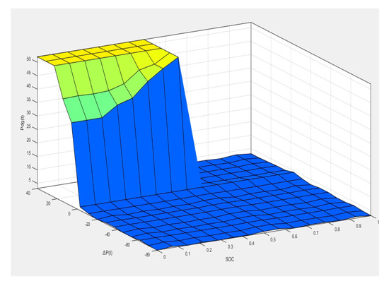 The fuzzy logic rules for FLC1 are shown in Table 3. The power difference (P) between the current power demand and the current renewable power is the first input into FLC1, while the battery state of charge (SOC) is the second input. The controller uses the value of P and SOC at each time to determine whether to charge the battery or discharge the battery. The correction power factor is the output of FLC1 that determines how much energy is used to charge the battery or is discharged from the battery. Figure 13 shows a three-dimensional view of the output of the FLC1 controller.