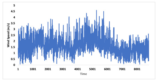 where is the reference height; is the reference height’s wind speed; refers to the exponent; is the height of the wind turbine; V is the wind speed at m; m/s is the rated wind speed of the wind turbine; is the constant power; m/s is the cut-in speed; and m/s is the cut-out speed.