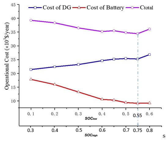 where is the load, is the self-discharge rate an hour, and is the energy generated. Equation (8) is used for the battery charging, while Equation (9) is used for the battery discharging. The battery optimally operates between the allowable discharge limit, denoted as , and the allowable maximum charge limit, denoted as .