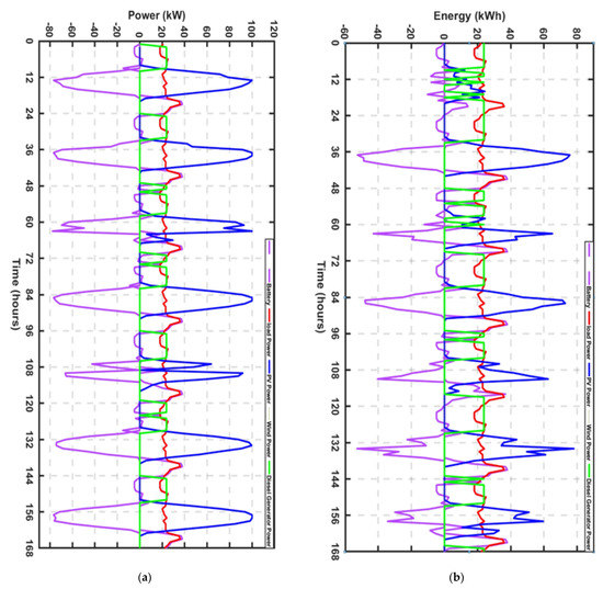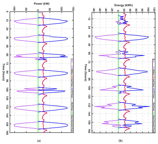 Furthermore, by comparing the two seasons, it can be seen that more solar energy was generated during the dry season than during the wet season, and by the same comparison, more DG energy was used during the wet and dry seasons. In either case, there was no output power from the wind turbine, because the wind turbine was not considered in this FLC-EMS, because the wind turbine sizing from the PSO algorithm was zero. The generator sizing used in the FLC (35 kW) was higher than the sizing from the PSO (25 kW). This was to provide operating tolerance and stability for the DG. The extra energy from the DG was being used to charge the battery. Additionally, by comparing the graph of the PSO and the FLC, it can be seen that there is a faster response during the energy transition in the case of the FLC than in the case of the PSO. This faster transition offers stability and prevents disruptions during HRES operations. Therefore, FLC-EMS offers stability and the optimal utilization of the energy resources during HRES operation; it offers reliable energy irrespective of the weather conditions and load fluctuations. The EMS was able to provide energy to the load both in the dry season and in the rainy season. Figure 28a,b show that the FLC-EMS could keep the battery SOC within the desired range of 55% to 80%.
