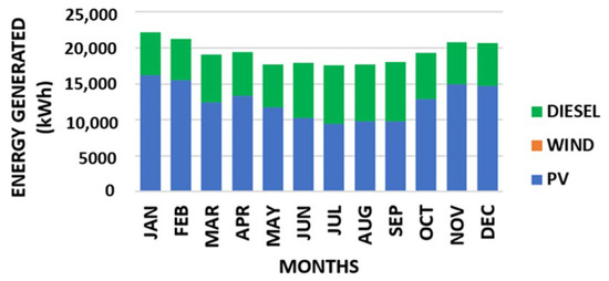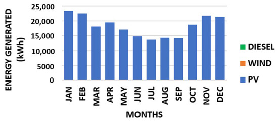 The monthly energy contributed by each energy source for the first scenario is shown in Figure 25; solar energy is the only energy source available for scenario 1. The monthly energy contributed by each energy source for the second scenario is shown in Figure 26. For both scenarios, the seasonal effects can be seen in the amount of energy generated from the PV. More solar energy was produced during the dry season (October–March), and less diesel energy was used. On the other hand, less solar energy was produced during the rainy season (April–September), and more diesel energy was used. For both scenarios, the total annual energy generated equaled the total annual energy demanded plus the total annual lost energy factored into the efficiency of the equipment.