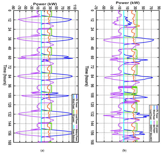 The performance indicators for the fuzzy-logic-controlled EMS are the SOC of the battery and the energy balance of the HRES. By using the FLC-EMS, the SOC is expected to be kept within a certain range to ensure battery longevity. The energy balance of the HRES for each time unit measures the effectiveness of the EMS. The energy balance is the summation of all energy sources minus the load, and it is expected to be zero if the supply meets the demand at each time. Figure 27a,b show the combined diagrams of all energy sources, for January (a) and August (b), respectively. These figures show that the energy balance (blue line) is equal to zero for each hour, indicating that the fuzzy logic controller effectively ensures energy balance.