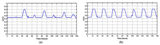 State of charge (SOC) for 1 week: (a) January and (b) August.