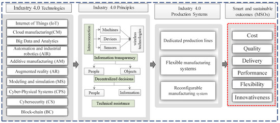 Manufacturing strategies (MSs) are long-term plans for utilizing manufacturing system resources to achieve organizational goals [15]. The MS is a strategy established to obtain optimal outcomes while maintaining an appropriate balance between different desired outcomes. Implementing an MS entails aligning manufacturing goals with business objectives to boost the manufacturing output [15]. Top management should ensure that all manufacturing policies are designed with, or support, the corporate strategy [16]. Manufacturing has become a critical competitive differentiator that establishes a company’s identity in the market [17]. I4.0 is a modern industrial system driven by information technology (IT) and by the aim of attaining a sustainable society. I4.0 has delivered new production technologies that maximize output and resource use. To acquire a holistic idea, the appropriate I4.0 technologies and principles, the production systems, i.e., the raw materials, energy, and information needed to turn inputs into outputs to obtain intelligent and sustainable products, are required, as shown in Figure 1.