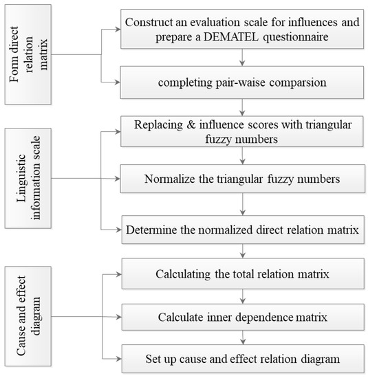 The fuzzy DEMATEL method involves the collection of indicators implying the degree of influence and cause–effect relationship for each factor, as well as the creation of a causality map. To better solve problems, this method develops a causal diagram based on the relationships between factors, determines the center degree and cause degree of each factor, categorizes them (cause group or effect group), and finally selects the most important factors [83]. Figure 3 shows the general steps of the fuzzy DEMATEL approach.
