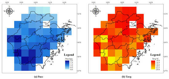 As the first step of this study, the specific thresholds for the different grids in Zhejiang Province were determined from the long-term observations. Figure 3 shows the thresholds of the two variables. It can be found in Figure 3 that the threshold for showed a decreasing trend from south-west to north-east (Figure 3a), which was similar to the trend of the DEM (Figure 2). To be more specific, the threshold for the in the mountain and hill areas from the south-west was higher than that in the coastal areas dominated by the plains from the north-east. The maximum value for the threshold of the was shown in the north part of the study area, and the threshold in the southern part was relatively small (Figure 3b).