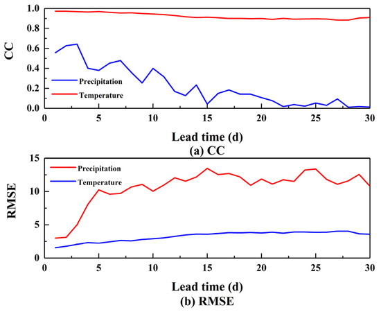 The second part of this study aimed to evaluate the performance of the NWF in Zhejiang Province. Firstly, the averages of the precipitation and temperature forecasts for the study area from different lead times were evaluated through the CC and RMSE, as shown in Figure 5. The performance of the CC for the two variables in the Figure 5a showed a downward trend as the lead time grew. Moreover, the CC of precipitation exhibited obvious fluctuations, while the results for the temperature were more stable. From Figure 5b, the temperature showed a quite similar performance, i.e., the RMSE had a very slight increase with the lead time. However, the RMSE of the precipitation showed more dramatic changes, especially when the lead time exceeded 3 days. To be more specific, the RMSE of the precipitation increased rapidly when the lead time was between 3 days and 5 days and remained relatively stable for the lead time over 5 days. Furthermore, the results in Figure 5 also indicate that the accuracy in forecasting the temperature is higher than for the precipitation.