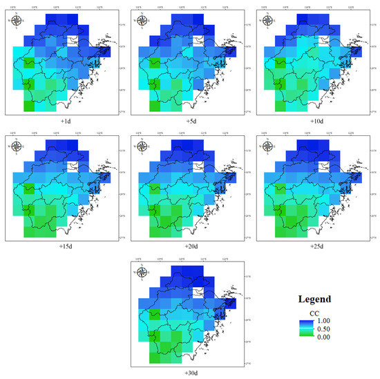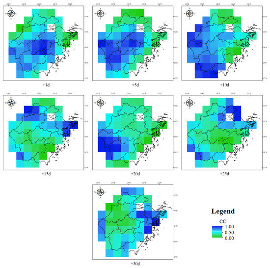 The spatial distribution of the CC for the precipitation forecast in the study area.