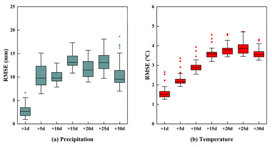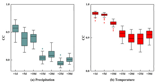 Figure 6 and Figure 7 show the spatial distribution of the CC and the RMSE for the precipitation forecast using the NWF, respectively. The performance of the precipitation forecast in the western part was more accurate when the lead time was within 20 days, while the eastern coastal areas performed better when the lead time was over 20 days. Moreover, the performances of the CC and RMSE were not similar, which means that a higher CC did not lead to a smaller RMSE for the precipitation forecast. The spatial distributions of the CC and RMSE for the temperature forecast are shown in Figure 8 and Figure 9, respectively. From Figure 8 and Figure 9, we can see that the spatial distributions of the CC and RMSE for the temperature forecast varied slightly with the change in the lead time. The temperature forecast in the north-eastern part, generally, had a better performance. The low CC and high RMSE were clear in the south-west of the study area. In addition, the spatial distributions of the CC and the RMSE also implied that the temperature forecast was more accurate than the precipitation forecast. The boxplots of CC and RMSE for the grids from different lead times are shown in Figure 10 and Figure 11. The horizontal line in the box represents the median of the distribution (50% of the data are greater than this value), and the upper and lower box limits represent the upper and lower quartiles (25% of data greater/lower than the value), respectively. The top and bottom horizontal lines represent the maximum and minimum values of the two-thirds of the quantile, respectively. The outlier points show values more than two-thirds of the quantile. From Figure 10 and Figure 11, the change trends of the RMSE and CC for the NWF with the lead time were more obvious. The distribution range of the boxes became larger with the increase in the lead time, except for the CC from the precipitation forecast, which means the accuracy of the NWF was unstable when the lead time exceeded a certain limit. According to the results from Figure 5, Figure 6, Figure 7, Figure 8, Figure 9, Figure 10 and Figure 11, it can be found that the performance of the temperature forecast is better than that of the precipitation forecast, and the results from the precipitation forecast may be unreliable and lead to a false or missing alarm for a potential flash drought with the increase in the lead time.