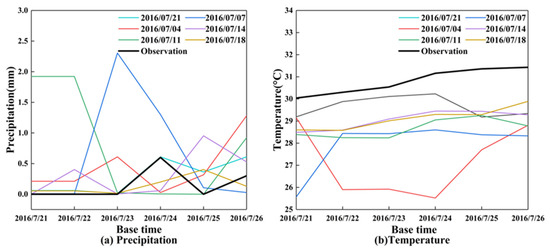 The deterministic precipitation and temperature forecasting results for the flash drought events from 22 July to 26 July 2016. (a) Precipitation and (b) temperature. Note that the x-label is the base time (i.e., the start time of the forecast).