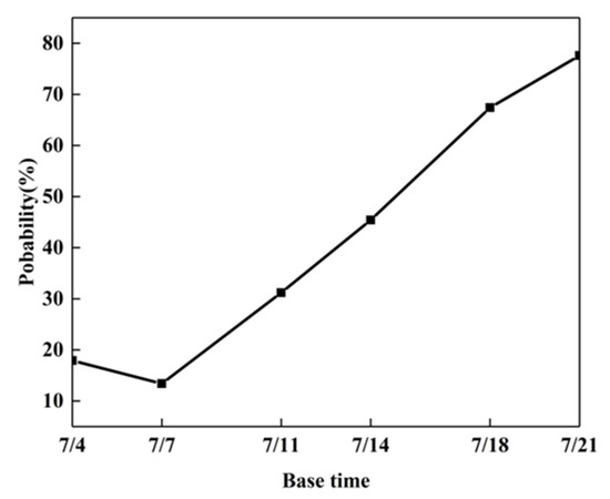 To show the difference between the probabilistic forecast and the raw NWF, the probability of a flash drought from different base times through the probabilistic forecast is shown in Figure 13 and a direct comparison between the two forecast results from different base times is presented in Table 2. Note that, since the results of the raw NWF were deterministic, the probability of a flash drought can only be 0 (if the forecast result does not fit the thresholds of flash drought) or 100% (if the forecast result fits the thresholds of flash drought). It can be also found in Table 2 that the probability of a flash drought with a short lead time was much higher than that with a long lead time. The increasing trend in the probability of flash drought is more evident, as shown in Figure 13, and the increasing trend gradually slowed as the base time changed. Compared to the results of the raw NWF, the probability of a flash drought based on probabilistic forecasting has better performance for a long lead time, but the performance was worse for the base time with a short lead time. Another main concern, discerned from Table 2, is that the accuracy of the probabilistic forecast with the long lead time was still quite low. The main advantage of the probabilistic forecast is that it can still provide the potential risk of a flash drought when the lead time exceeds 5 days, which is useful for the early warning of and preparation for flash droughts. According to the probabilistic forecasting results, it is a feasible method to set a probability threshold based on the preferences of decision makers to determine whether a strategy for flash droughts should be prepared. For example, if the probability threshold is 30%, the effective lead time can be extended to 12 days since the probability of flash droughts surpassed 30% for the base time of 11 July. In practical application, probabilistic flash drought forecasting can provide more information about risks and should be analyzed in line with the preference of the decision-maker to formulate reasonable strategies for minimizing the impact of a flash drought.