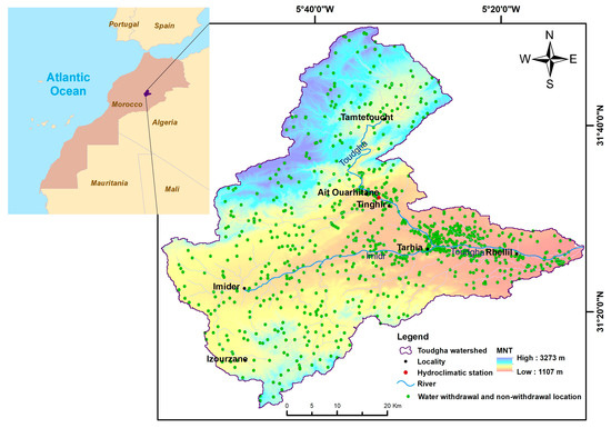 The study was conducted within the Toudgha watershed, which is in the southeast of the Moroccan kingdom and covers an area of 2296 km2, ranging between 31°51′35″ N–31°9′14″ N and 5°10′45″ W–5°57′01″ W (Figure 1). The area is characterized by an arid climate [3],which is strongly influenced by the continental and desert context. The interannual average rainfall is 154 mm, which shows high spatial and temporal variability marked by a spatial difference in the average precipitation of 110 mm between the northwest (i.e., the mountainous region) and the southeast (i.e., the lowland region) and a temporal difference in the average precipitation of 295 mm between the wettest and driest years. The daily thermal difference may reach 22 °C, with a monthly average temperature ranging between 8 °C and 27.8 °C.