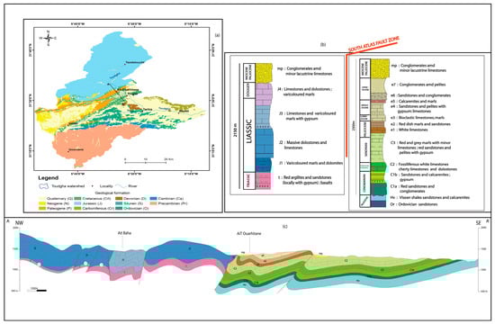 Geological setting of the study area. (a) Simplified geological map; (b) high and Anti-Atlas stratigraphic logs (in [36]); (c) geological cross-section (in [36]).