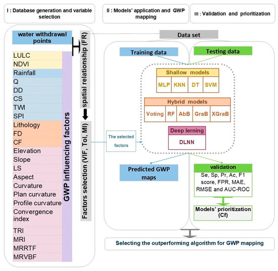 In the present research, ten groundwater potential prediction models were applied, evaluated, and compared, including using different types of existing algorithms [28]: shallow models, i.e., traditional ML models, hybrid models (bagging, boosting, ensemble), and deep learning models. The used models were: multilayer perceptron (MLP), k-nearest neighbor (KNN), DT, SVM, voting, RF, adaptive boosting (AdB), gradient boosting (GraB), eXtreme gradient boosting (XGraB), and deep learning neural network (DLNN). These algorithms were selected due to them being the most commonly used individual models; this allowed us to compare our findings with previous results demonstrated in different environments as investigated by [13,20,23,29], etc. Furthermore, they are the most powerful boosting and deep learning models, and we used the models in order to overcome the research gap related to the comparison and validation of different types of GWP modeling algorithms.
