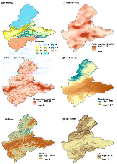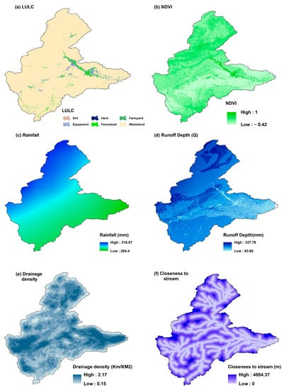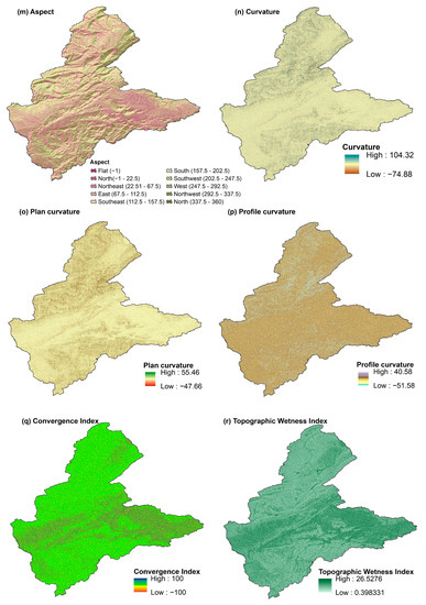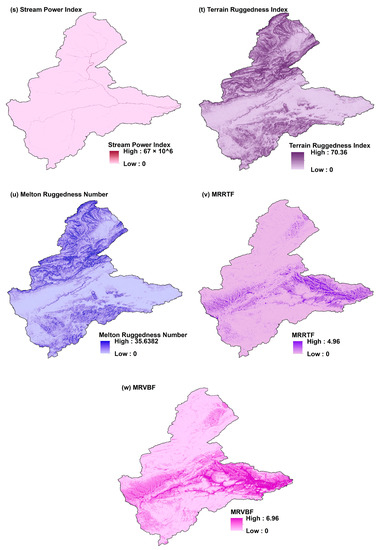 Maps of the groundwater potential-influencing factors. (a) LULC; (b) NDVI; (c) rainfall; (d) runoff depth; (e) drainage density; (f) closeness to stream; (g) lithology; (h) faults density; (i) closeness to faults; (j) elevation; (k) slope; (l) slope length; (m) aspect; (n) curvature; (o) plan curvature; (p) profile curvature; (q) Convergence Index; (r) Topographic Wetness Index; (s) Stream Power Index; (t) Terrain Ruggedness Index; (u) Melton ruggedness number; (v) multi-resolution ridge top flatness; (w) multi-resolution valley bottom flatness.