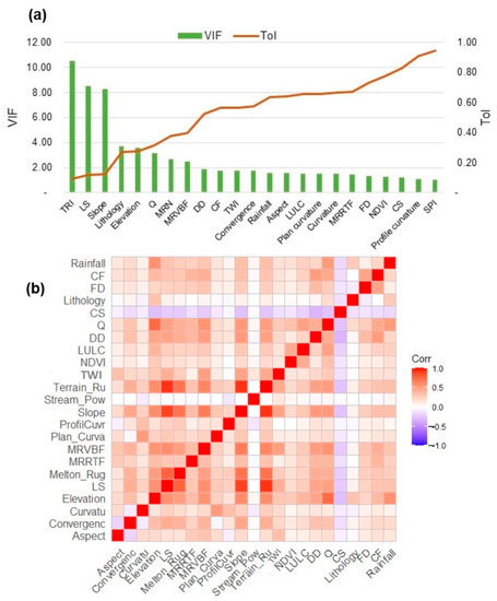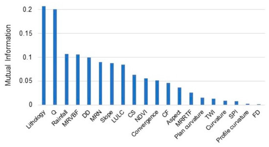 The results of the multicollinearity analysis show a Tol value that ranges between 0.95 and 0.095 for the SPI and the TRI, respectively, as well as a VIF maximum value of 10.5 for the TRI and a minimum value of 1.06 for the SPI (Figure 5a). The CM depicted a strong linear correlation between the following factors: elevation with the runoff, the LS with the slope, and the TRI with the LS, where the highest VIFs among each pair are presented for the TRI, the Ls, and the elevation (Figure 5b). Afterwards, and according to the Tol and VIF requirements cited above, among the twenty-three factors, the TRI, the LS, and the slope were removed in the following analysis. After that, the MI of the other twenty factors (Figure 6) presents positive values that range from 0.207 (lithology) to 0.0005 (FD). Therefore, lithology is classified as the most important, followed by the Q (MI = 0.201) and the rainfall (MI = 0.106).