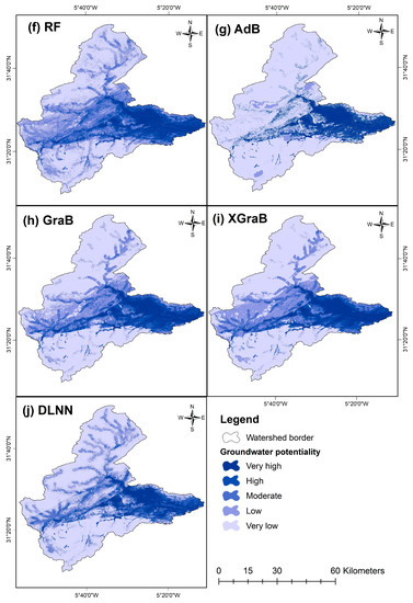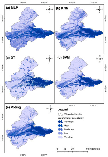 The first visual analysis of the ten resulting maps produced by the MLP (Figure 7a), KNN (Figure 7b), DT (Figure 7c), SVM (Figure 7d), voting (Figure 7e), RF (Figure 7f), AdB (Figure 7g), GraB (Figure 7h), XGraB (Figure 7i), and DLNN (Figure 7j) models shows that the very high GWP values are concentrated at the eastern part, particularly in the plain zone, and they are slightly represented in the western part. Meanwhile, the very low GWP values are localized in the northern and the southern part.