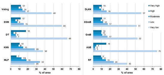 In the case of the hybrid models, the five GWP classes (very low, low, moderate, high, and very high) cover 48%, 17%, 14%, 9%, and 12% of the areas, respectively, for the voting model (Figure 7e and Figure 8), 40%, 24%, 15%, 11%, and 9% of the areas, respectively, for the RF (Figure 7f and Figure 8) model, 75%, 3%, 2%, 4%, and 26% of the areas, respectively, for the AdB model (Figure 7g and Figure 8), 52%, 17%, 11%, 10%, and 10% of the areas, respectively, for the GraB model (Figure 7h and Figure 8), and 51%, 17%, 12%, 9%, and 11% of the areas, respectively for the XGraB model (Figure 7i and Figure 8) respectively. For the deep learning model (i.e., DLNN), most areas are predicted as having very low (57%) and low (16%) GWP, and the remaining area is associated with moderate (9%), high (7%), and very high (10%) GWP values (Figure 7j and Figure 8).