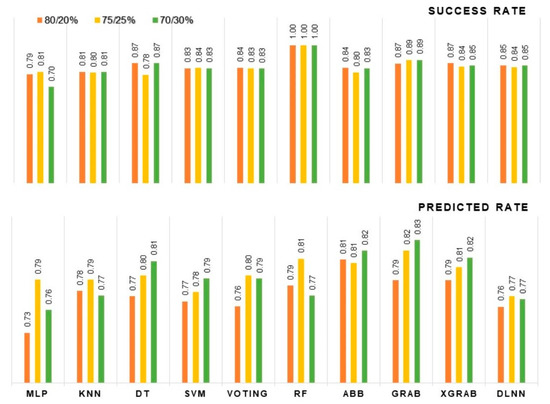 The success and prediction and rates of the applied models were examined for the training/testing partition at ratios of 70/30%, 75/25%, and 80/20% of the dataset; the results are shown in Figure 9. Considering the success rate for the three used partitions, the results show equal values for the RF (success rate = 1) and equal values (variation average of 0.02) over other models except for the MLP, which presents a slight variability. On the other hand, the prediction rate presents a slight variation between the results of the three partitions for each model. Nevertheless, a high prediction rate is noted for the GraB (0.83) models, followed by the AdB (0.82) and XGraB (0.82) models for the 70/30% partition.