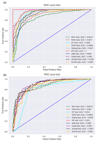 For the testing dataset, all of the applied models present a high to very high performance. The Se values range from 0.87 for the AdB and 0.77 for the KNN, the Sp, Pr, Ac, F1-score, FPR, MAE, and RMSE values are between 0.8 and 0.64, 0.8 and 0.67, 0.83 and 0.73, 0.83 and 0.73, 0.20 and 0.36, 0.17 and 0.28 and, 0.41 and 0.53, respectively, the maximum values are all marked for the GraB model, and the minimal values are all marked for the MLP model. The AUC-ROC ranges from 0.81 for the DT to 0.91 for the GraB.