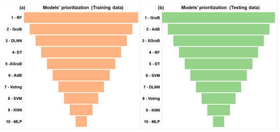 Models’ prioritization based on the compound factor. (a) In the training step; (b) in the validation step.