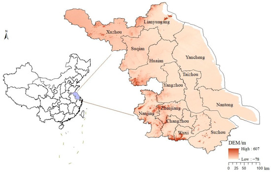 Located on the eastern coast of mainland China, Jiangsu Province contributes to more than 10% of China’s economic growth. Figure 1 shows the geographical location and administrative division in Jiangsu Province. Industrial electricity consumption in Jiangsu Province has grown at an annual rate of 9% with economic development [71]. The carbon emissions from electricity generation have become an important part of the reduction of carbon emissions as a result of the purely thermal power grid [15]. Simultaneously, there are significant differences in the resource endowments of different cities in Jiangsu Province. Coal resources are mostly concentrated in Xuzhou in the northwest, with fewer in southern and central Jiangsu. Therefore, carbon emissions from coal industry vary greatly from city to city.
