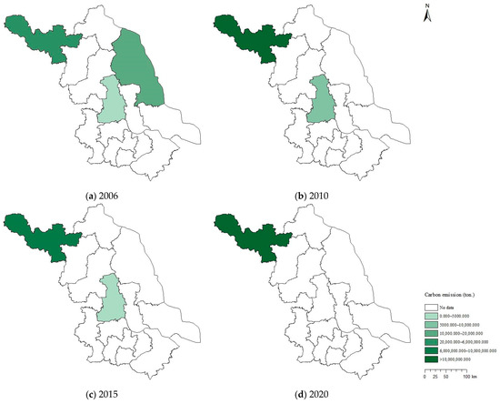 Overall, Jiangsu Province is a large province in terms of energy consumption and carbon emissions, in addition to being a large economic province [72]. It should play a role as a model and benchmark in China’s efforts to reduce carbon emissions. Therefore, taking Jiangsu province as the research object, this paper examines the spatial and temporal evolution characteristics of carbon emissions from coal industry and power industry at the city level and the synergistic effect of carbon emissions between industries.