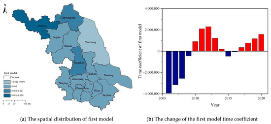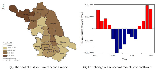 The variance contribution of the second model of carbon emissions in the power industry is 11.09%, showing a north-south opposing pattern of development (Figure 6a). The time coefficient of the second model has more inter-annual variation characteristics than the first model (Figure 6b), with 2011 as the inflection point showing a U-shaped trend. The time coefficient was positive until 2009, negative from 2010 to 2016, and turned positive from 2017 to 2020, representing the inter-annual anomalies in carbon emissions. While the growth rate of carbon emissions accelerated in the north during 2006–2009 and 2017–2020, it slowed down in the south. The characteristics of spatial distribution became less typical in the former period and more typical in the latter period. While the growth rate of carbon emissions slowed down in the north during 2010–2016, it accelerated in the south.