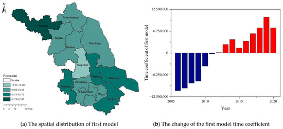 The variance contribution of the first model of carbon emissions in the power industry is 75.64%, far exceeding that of the second model. It reflects the overall spatial distribution of carbon emissions (Figure 5a). Except for Yangzhou, all other regions have positive eigenvalues, indicating that the trend of carbon emission changes in the power industry from 2006 to 2020 is essentially consistent in space, i.e., the carbon emission level is consistently increasing or decreasing. The time coefficients for the first model show a consistent upward trend (Figure 5b). The negative values and decreasing absolute values from 2006 to 2011 indicate that the spatial distribution of such carbon emissions was most typical in 2006, and its typicality gradually decreased, during which the growth rate of carbon emissions in the power industry slowed down, except for Yangzhou. From 2012 to 2020, they all showed positive values and increasing absolute values, and the typicality of this spatial distribution tended to strengthen as the growth rate of carbon emissions in the power industry increased, except in Yangzhou.