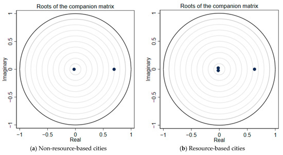 In order to accurately reflect the dynamic relationship between variables and maintain the validity of parameter estimation, this study uses Akaike information criteria (AIC), Bayesian information criteria (BIC), and the Hannan-Quinn information criteria (HQIC) to determine the optimal lag order of the model. According to Table 7, the optimal lag order of the PVAR model is 1 for both resource-based and non-resource-based cities, and the PVAR models with first-order lags are constructed for resource-based and non-resource-based cities, respectively.