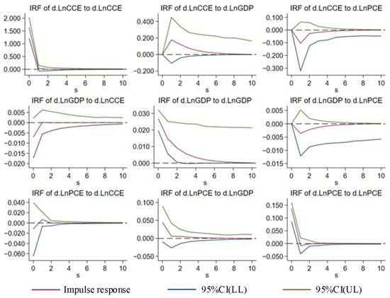 The impulse response function can further measure the change in variables caused by a random perturbation of a variable, reflecting the dynamic interaction between variables as well as predicting the degree of lag and influence between the variables. However, the PVAR model’s stability should be tested before performing the impulse response function analysis. As shown in Table 9 and Figure 7, the inverse of all unit roots is distributed within the unit circle, indicating that the first-order PVAR model constructed in this part based on the panel data of economic development and carbon emissions in the coal and power industries is robust. It is eligible to continue the impulse response shock and variance decomposition analysis.