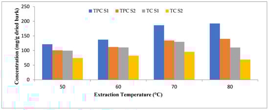 | Extraction Time | Extraction Conditions | Total Phenolic Contents (mg GAE/g Bark) S1 (A. nilotica) | Total Phenolic Contents (mg GAE/g Bark) S2 (E. globulus) | Tannin Contents (Hide Powder Method mg/g) S1 (A. nilotica) | Tannin Contents (Hide Powder Method mg/g) S2 (E. globulus) |