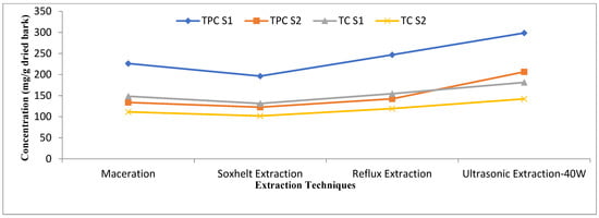 | 2 h | Maceration (shaking water bath Ac:Water(70:30)-5 g bark-150 mL solvent-70 °C | 106 | 53.9 | 69.6 | 52.4 |