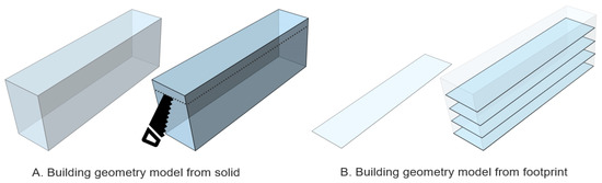 Building geometry modelling can be obtained from the “slicing” of a 3D solid or from extrusion of the building footprint. Figure 1 summarises the cutting (A) and extrusion (B) methods graphically.