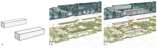 As listed in Table 1, Elk was selected for point and metadata extraction from OSM (OpenStreetMap) files due to its simplicity and good operability. Urbano adds automation features to the OSM download and supports both Shapefile and Lidar formats, which can be imported and positioned on the correct coordinates using a translation vector, referencing data previously sourced from OpenStreetMap. Volvox was employed to validate the volume and height of the geometries obtained manually. As shown in a graphical summary in Figure 4, the different building geometries (A) overlapped with the “real” 3D surface model obtained from the Airborne Laser Scanning, LIDAR (B) dataset to ensure there were no significant discrepancies through manual inspection (C).