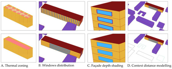 Four simplification measures were tested to optimize accuracy and computational cost of the thermal model. The 3D model shows the building with colour-coded features. Red is the roof, yellow is exterior walls, blue is apertures, and purple is the context. Subfigures (A–D) depict the effects of thermal zoning, window distribution, facade depth/thickness, and context distance modeling, respectively.