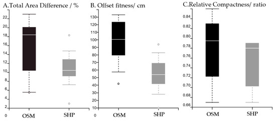 Boxplot results comparison of modelling with OpenStreetMap and shapefiles from cadastre for (A) Area difference of resulting models, (B) Offset needed to fit EPD area, and (C) Relative compactness ratio of resulting geometries.