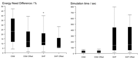 Boxplot distribution of energy need difference and total simulation time results of the different GIS sources.