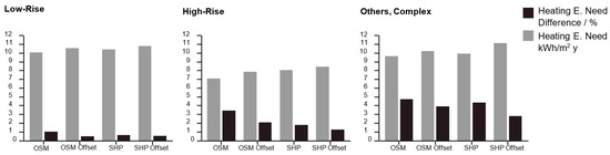 The measured heating energy in the EPCs was used to benchmark the percent difference between the energy models obtained from the two datasets before and after the area fitting of the building’s footprint. As shown in Figure 7, results show that the gap in energy performance was lower when using SHP (5% to 25% after area adjustment). Nevertheless, the simulation time increase when using SHP was up to eight times higher compared to OSM.