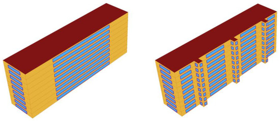 Contrarily, other building typologies, such as high-rise and complex buildings showed significant differences between the modelling procedures using OSM and SHP. These buildings have more complicated footprint geometries, which explains the larger deviation when modelled using a more simplistic method such as OSM. In Figure 9, a visual comparison is shown of a high-rise building modelled using the OSM footprint on the left and the cadastral shapefile on the right.