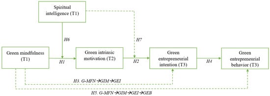 Subsequently, we propose that escalated levels of GEI turn into enhanced GEB. There is a broad agreement that supports the corollary that GEI translates into increased GEB. For instance, one of the widely utilized application is Ajzen’s TPB [19]—which is an extension of Ajzen and Fishbein’s TRA [48]—which explains entrepreneurial intention as a readiness to execute entrepreneurial behavior [11]. The theory purports that the stronger the intentions of an individual to engage in entrepreneurial behavior, the more likely that person will start a new business [53]. The underlying notion behind this argument is the strength of GEI, which indicates the extent to which an individual is encouraged to engage in GEB because it represents the amount of effort a person is willing to invest in business activities [54]. Drawing on the SDT [22,23], we propose that individuals who draw on their unique cognitive resources, i.e., G-MFN, are more likely to develop deep enthusiasm and interest in executing GEB through GIM and GEI. This is because individuals who have higher compassion for the environment are internally driven to manifest behaviors that promote environmentalism, thereby providing a more compelling reason to turn their GEI into GEB.