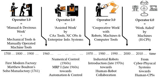 In the literature, to represent the new role of humans in the Industry 4.0 paradigm, the concept of Operator 4.0 [,] has been introduced as the arrival point of an evolutionary path of human–technology interaction, which is represented in Figure 3.
