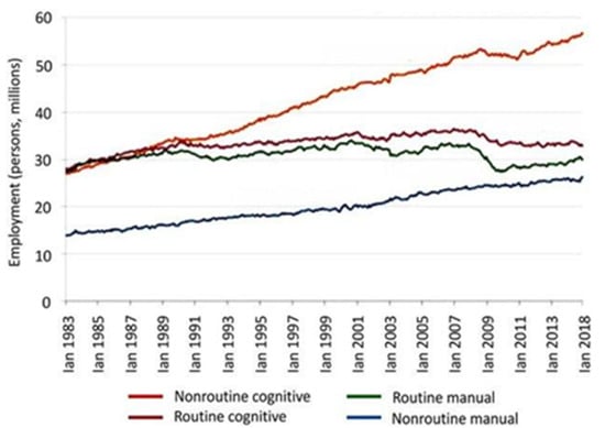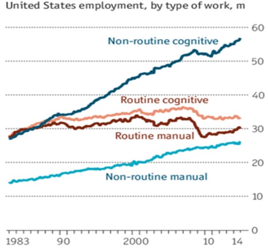 Analyzing the US labor market, Ref. [] provided a picture of workers’ tasks, highlighting that, in the last few decades, the demand for cognitive and nonroutine tasks has increased while that for routine tasks has decreased significantly. The Economist has depicted the same situation in its trend report in Figure 4 (1983–2014) [], which was later updated by [] to include up to the year 2018 (see Figure 5), both supporting the trend identified by [].
