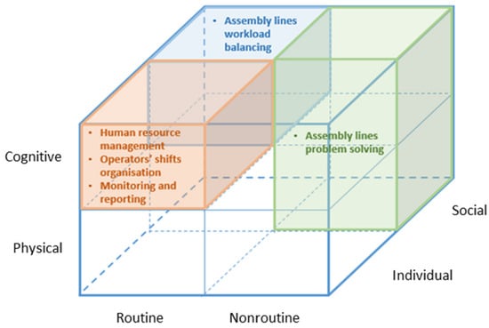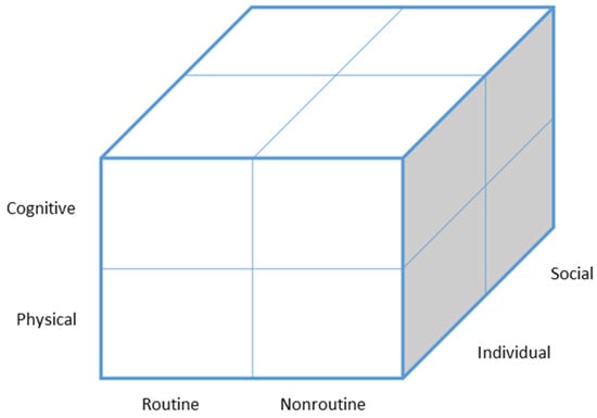 The second dimension concerns physical tasks and cognitive tasks. The difference between the two, in this case, is more intuitive: physical (manual) tasks are physical activities that can be defined in terms of a set of movements and require sensorial abilities [], while cognitive tasks, on the other hand, concern mental activities [].