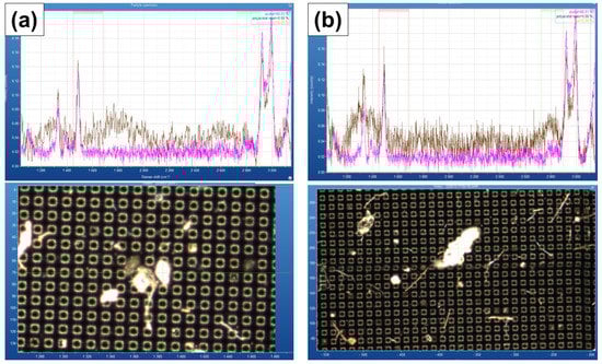 Fragments of microplastics present in devices, which are only a few microns in size, can affect the analysis results []. The microplastics present in a typical laboratory environment can affect microplastic samples with sizes of a few microns [,,]. In another study of ours, POM fragments were found in environmental and falling blank samples during the sampling process, which used a polyoxymethylene (POM) cassette in the most commonly used low-volume air sampler. However, as a result of using a stainless filter and cassette, the POM cassette was no longer found in the atmospheric sample (Figure 1 and Table 1).