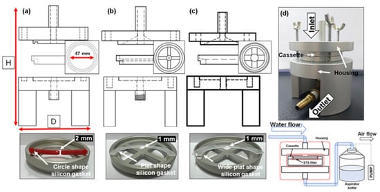 A device was developed to sample small-sized microplastics over 5 µm in environmental media. In addition, it was modified into three types according to the problems that occurred during the sampling process. The sampling device is based on a filtration method to allow for flexible filter pore size and easy filter replacement after contamination. Each device was manufactured according to the design depicted in Figure 2. All sampling devices consisted of a housing and cassette, and each cassette was watertight with a silicone O-ring or gasket. The cassettes could be easily stacked in multiple stages within the housing. In the case of conventional sampling and pretreatment devices, additional units (several individual housings) or processes for size classification were required. However, the developed sampling device requires only one compact housing and several optional cassettes for size classification. In this study, three-stage cassettes equipped with filters of different pores were used for size classification. The devices were made from an aluminum alloy with a low cost, easy machinability, light weight, and higher chemical resistance than conventional metals such as stainless steel. The device was modified and supplemented to increase the recovery rate of the microplastic sampler. Similar to other studies, by applying a stainless steel (STS) filter, it was possible to collect a large volume of samples and microplastics measuring several microns with the device at the user’s discretion. In addition, the STS filter could withstand vacuum pump pressure and had a strong chemical resistance, maintaining filter pore during sampling and pretreatment.