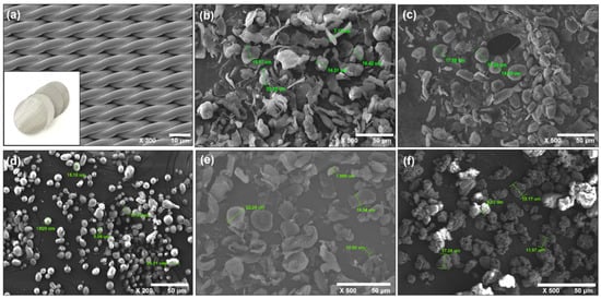 SEM image of (a) a STS filter, (b) polyethylene, (c) polyethylene terephthalate, (d) polystyrene, (e) polypropylene, and (f) polyvinyl chloride.