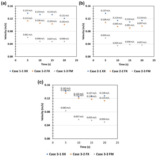 Average water flow velocity through sampling devices. (a) Device 1, (b) Device 2, and (c) Device 3. Symbols in this graph represent the case as follows—XX: without filter and microplastics, FX: equipped filter, FX: equipped filter with microplastic in water flow.